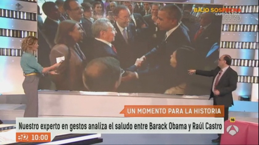 INDICADORES DE MENTIRA Y APRETÓN DE MANOS ENTRE OBAMA-RAUL CASTRO 13 abril, 2015 José Luis Martín Ovejero Colaboración Televisión, Expresión facial, Gestualidad, Háptica (el tacto), La mentira, Paralenguaje Deja un comentario Comparte esto: Haz clic para enviar un enlace por correo electrónico a un amigo (Se abre en una ventana nueva) Correo electrónico Haz clic para imprimir (Se abre en una ventana nueva) Imprimir Tweet Haz clic para compartir en WhatsApp (Se abre en una ventana nueva) WhatsApp MásMe gusta Cargando...