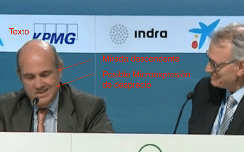 1- Cuando dice la frase «qué…eee…e…e…. nos vamos a poner de acuerdo» va reduciendo paulatinamente su tono de voz. La última parte, «nos vamos a poner de acuerdo» la dice con un tono de voz mucho más bajo que el tono que ha mantenido a lo largo de la conversación y viene acompañado de de la cabeza ligeramente agachada, mirando con los ojos de abajo a arriba. Además lo dice a mucha velocidad algo que hacemos cuando queremos «zanjar» algo. Si hubiese estado tan convencido como dice de sus palabras, hubiera pronunciado la frase de de manera más lenta, haciendo énfasis en las mismas . Esto se puede traducir de bastantes maneras, pero desde luego ninguna de ellas transmite credibilidad.