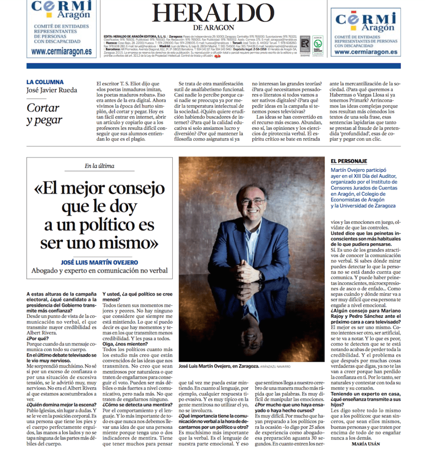 HERALDO DE ARAGÓN – La comunicación no verbal ideal es la autenticidad 11 diciembre, 2015 José Luis Martín Ovejero Colaboración Prensa, Destacados, Expresión facial, Gestualidad, Varios Deja un comentario Comparte esto: Enviar un enlace a un amigo por correo electrónico (Se abre en una ventana nueva) Correo electrónico Imprimir (Se abre en una ventana nueva) Imprimir Tweet Compartir en WhatsApp (Se abre en una ventana nueva) WhatsApp MásMe gusta Cargando...
