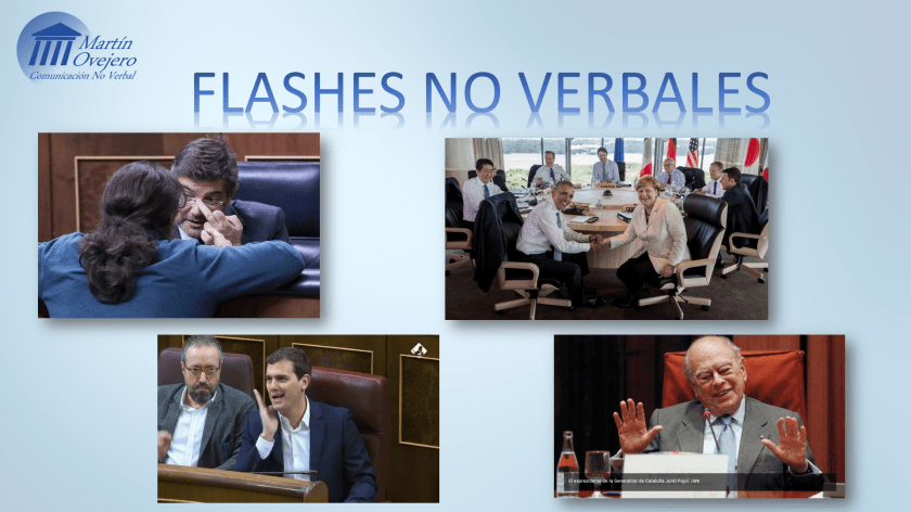 FLASHES NO VERBALES 27 mayo, 2016 José Luis Martín Ovejero Apariencia, Destacados, Expresión facial, Gestualidad, Háptica (el tacto), Oculesia (la mirada), Posición corporal, Proxémica (la distancia), Varios Deja un comentario Comparte esto: Enviar un enlace a un amigo por correo electrónico (Se abre en una ventana nueva) Correo electrónico Imprimir (Se abre en una ventana nueva) Imprimir Tweet Compartir en WhatsApp (Se abre en una ventana nueva) WhatsApp MásMe gusta Cargando...