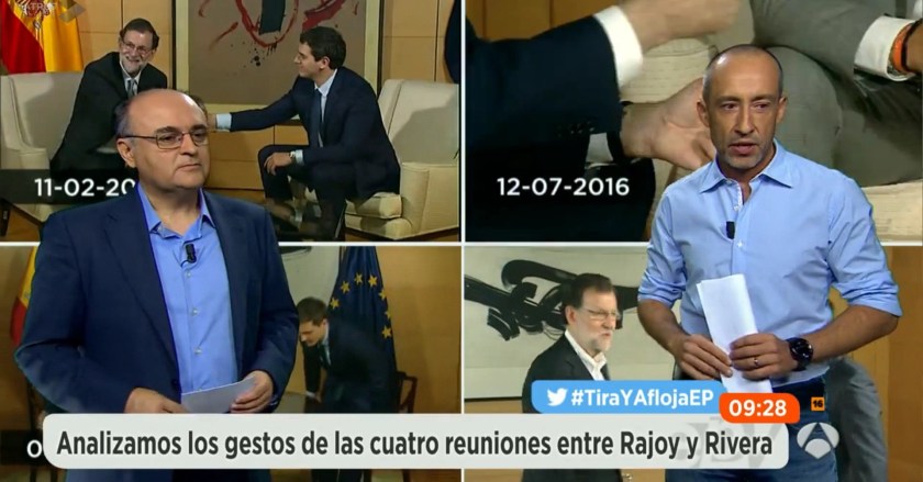Antena 3 (Espejo Público) – Los cambios en las relaciones entre Rajoy y Rivera 12 agosto, 2016 José Luis Martín Ovejero Apariencia, Colaboración Televisión, Expresión facial, Gestualidad, Oculesia (la mirada), Posición corporal, Varios Deja un comentario https://www.youtube.com/watch?v=L447_cnJYR4 Comparte esto: Haz clic para enviar un enlace por correo electrónico a un amigo (Se abre en una ventana nueva) Correo electrónico Haz clic para imprimir (Se abre en una ventana nueva) Imprimir Tweet Haz clic para compartir en WhatsApp (Se abre en una ventana nueva) WhatsApp MásMe gusta Cargando...