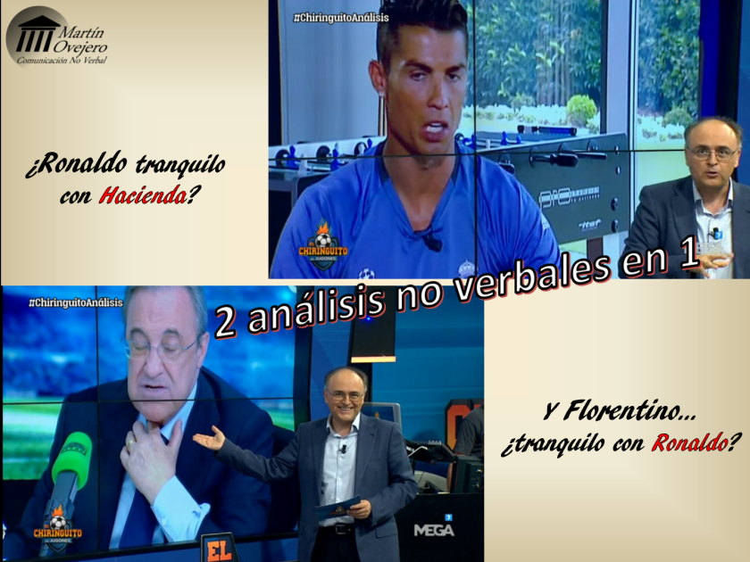 FLORENTINO PÉREZ – CRISTIANO RONALDO – HACIENDA. Sus comportamientos no verbales les delatan / MEGA (Jugones) 22 junio, 2017 José Luis Martín Ovejero Colaboración Televisión, Destacados, Expresión facial, Gestualidad, Háptica (el tacto), La mentira, Oculesia (la mirada), Paralenguaje, Posición corporal, Varios Deja un comentario Análisis de Comunicación No Verbal sobre Florentino Pérez y Cristiano Ronaldo (COMPLETO): http://mega.atresmedia.com/programas/el-chiringuito-de-jugones/ovejero-analiza-los-gestos_20170622594b11630cf23705fbdeb9a3.html INFORMATIVO DEPORTIVO DE LA SEXTA (JUGONES) DE LAS 15 HORAS: Hace un breve resumen del análisis de Cristiano Ronaldo: LA SEXTA JUGONES Comparte esto: Enviar un enlace a un amigo por correo electrónico (Se abre en una ventana nueva) Correo electrónico Imprimir (Se abre en una ventana nueva) Imprimir Tweet Compartir en WhatsApp (Se abre en una ventana nueva) WhatsApp MásMe gusta Cargando...