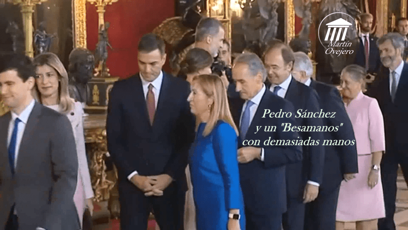 En el palacio real, los Reyes comenzaban a saludar a los invitados, lo que se conoce como “besamanos”. Los primeros en entrar han sido Pedro Sánchez y su mujer. Lo establecido por protocolo es que saluden y sigan su camino, pero en su lugar, se han quedado junto a los Reyes también.