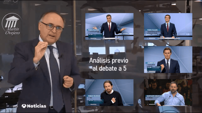 Para el análisis que haré el lunes en Antena 3 del debate a 5 tengo preparadas más de 100 pautas de comportamiento que observaré en los líderes políticos: en sus llegadas, saludos, debate, minutos de oro, despedidas…