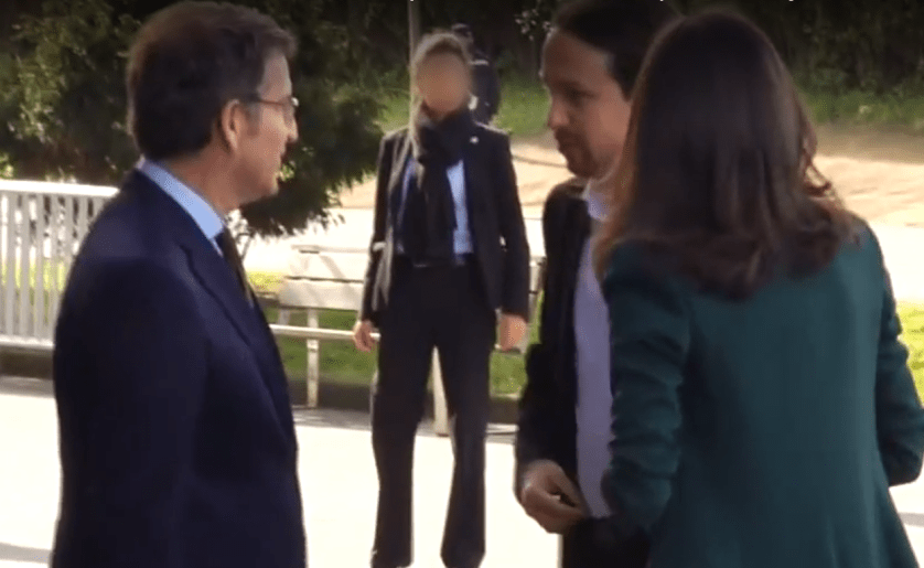 Al llegar a uno de los actos previstos en A Coruña, se advierte como Iglesias saluda al presidente de la Xunta de Galicia Núñez Feijóo, pero no así a la reina Letizia.