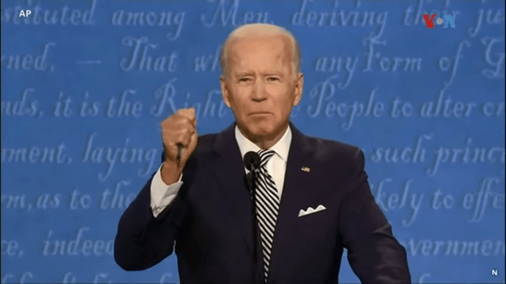 - TRUMP 4 – BIDEN 1 = BIDEN SE HA PASADO CASI TODO EL DEBATE AGARRADO A UN BOLÍGRAFO, tanto en su mano derecha como en la izquierda. Como tantas veces insisto con algunos políticos españoles, el boli es bueno para escribir, pero malo para hablar. Transmite inseguridad y ha perdido por ello gran parte de gestualidad. Un grave error que nunca había visto, hasta ahora, a un candidato a la presidencia de EEUU. Y ya como anécdota, incluso más que un bolígrafo parecía que llevara en su mano un cuchillo y quería a apuñalar a alguien.