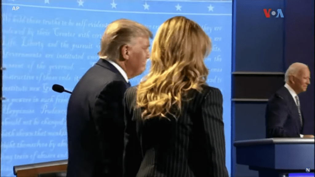 - TRUMP 1 – BIDEN 1 = LA AUSENCIA DE MIRADA DE TRUMP A CÁMARA: se ha centrado en lanzar sus argumentos a su oponente o al moderador, pero considero un error no establecer contacto visual con quienes le veían por su televisión, pues parecía no importarles. Esto sí que lo ha hecho Biden.