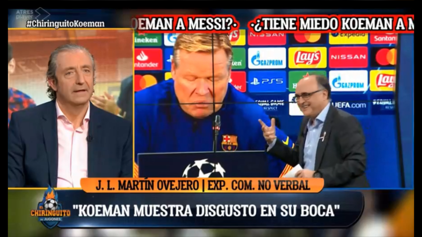 KOEMAN SE IMPLICA CON EL RENDIMIENTO DE MESSI 20 octubre, 2020 José Luis Martín Ovejero Colaboración Televisión, Destacados, Expresión facial, Gestualidad, La mentira, Oculesia (la mirada), Paralenguaje Deja un comentario Colaboración para el programa El Chiringuito de Jugones: Comparte esto: Haz clic para enviar un enlace por correo electrónico a un amigo (Se abre en una ventana nueva) Correo electrónico Haz clic para imprimir (Se abre en una ventana nueva) Imprimir Tweet Haz clic para compartir en WhatsApp (Se abre en una ventana nueva) WhatsApp MásMe gusta Cargando...