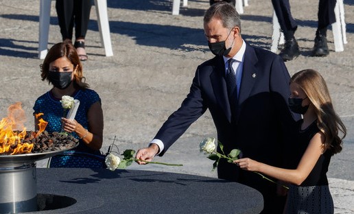 La Constitución Española y una única fotografía tomada durante el homenaje de Estado realizado el 15 julio de 2020. Refleja el momento en que él, junto a su hija, la princesa Leonor, depositan unas flores junto a una llama que recuerda a las víctimas por el coronavirus.