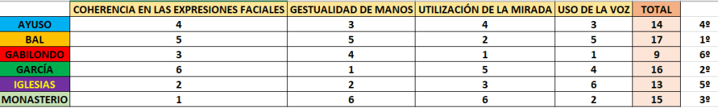 No obstante, tras haber analizado en ya bastantes ocasiones a los candidatos, se me ha ocurrido este juego: ¿Quién ganaría o perdería un torneo de oradores, centrándome solo en aspectos importantes individualizados de su comunicación?