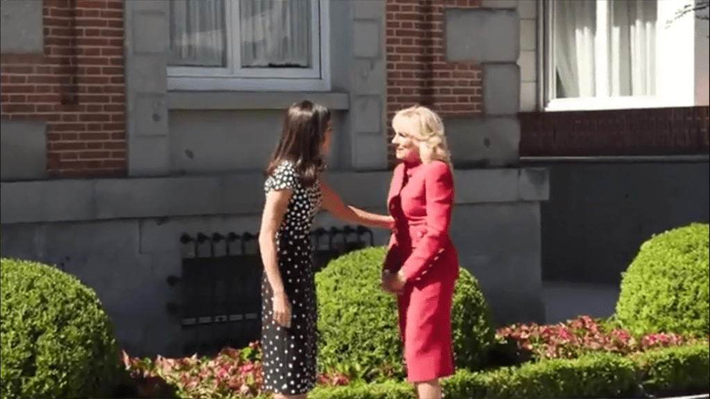 He visto a la Reina Letizia con muchos deseos de agradar a su invitada (todas las imágenes anteriores así lo demuestran); y Jill Biden, transmite mucha seguridad, tranquilidad y alegría (de rojo para no pasar desapercibida, con posiciones corporales cómodas y miradas tan directas como sonrientes).