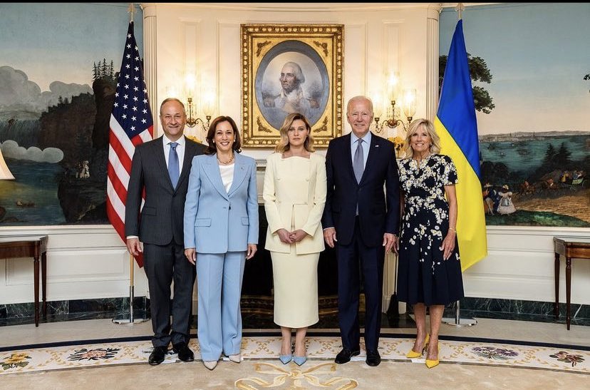 Esta imagen de la visita de Olena Zelenska, primera dama de Ucrania, a EEUU, posando junto al presidente Biden y esposa, así como junto a la vicepresidenta Harris y esposo, deja bastante información a ojos de la comunicación no verbal.