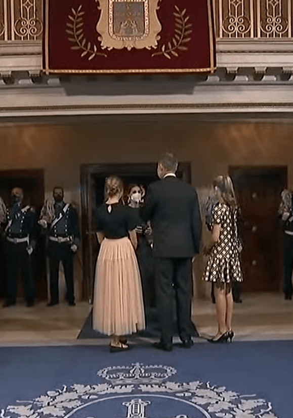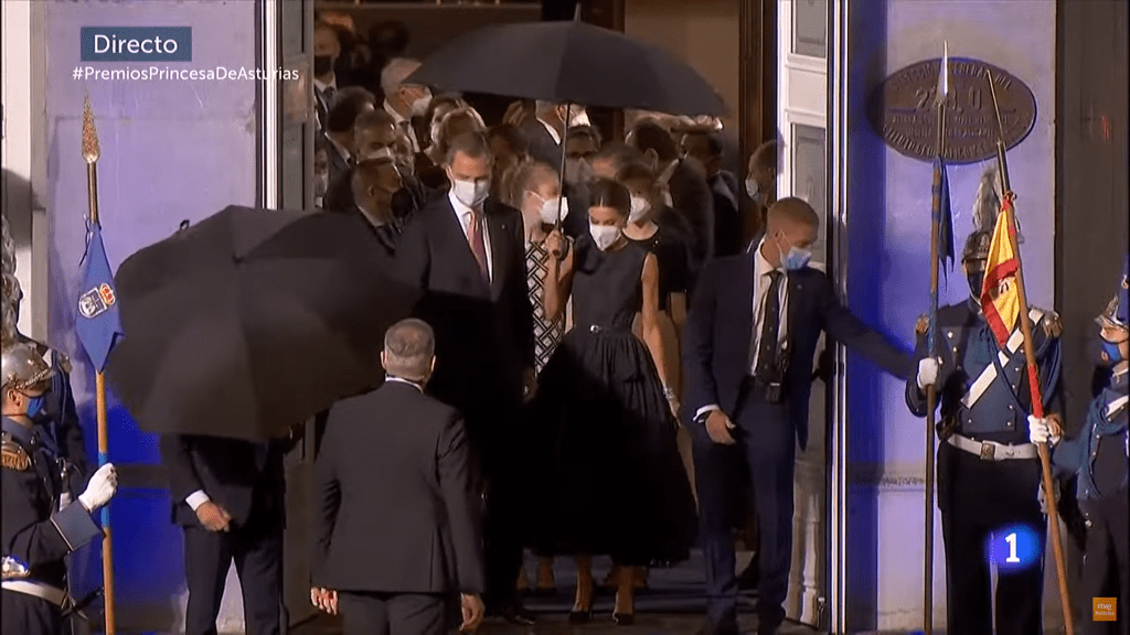 Al concluir la citada entrega de premios, cuando el matrimonio sale a la calle, el rey Felipe coge en su mano un paraguas que les cubría a ambos de la lluvia. Dª. Letizia se da cuenta del público congregado que les esperaba, y cede todo el protagonismo al rey cogiéndole el paraguas con el fin de que él tuviese sus manos libres para saludar. Observemos la secuencia fotográfica porque es muy interesante: