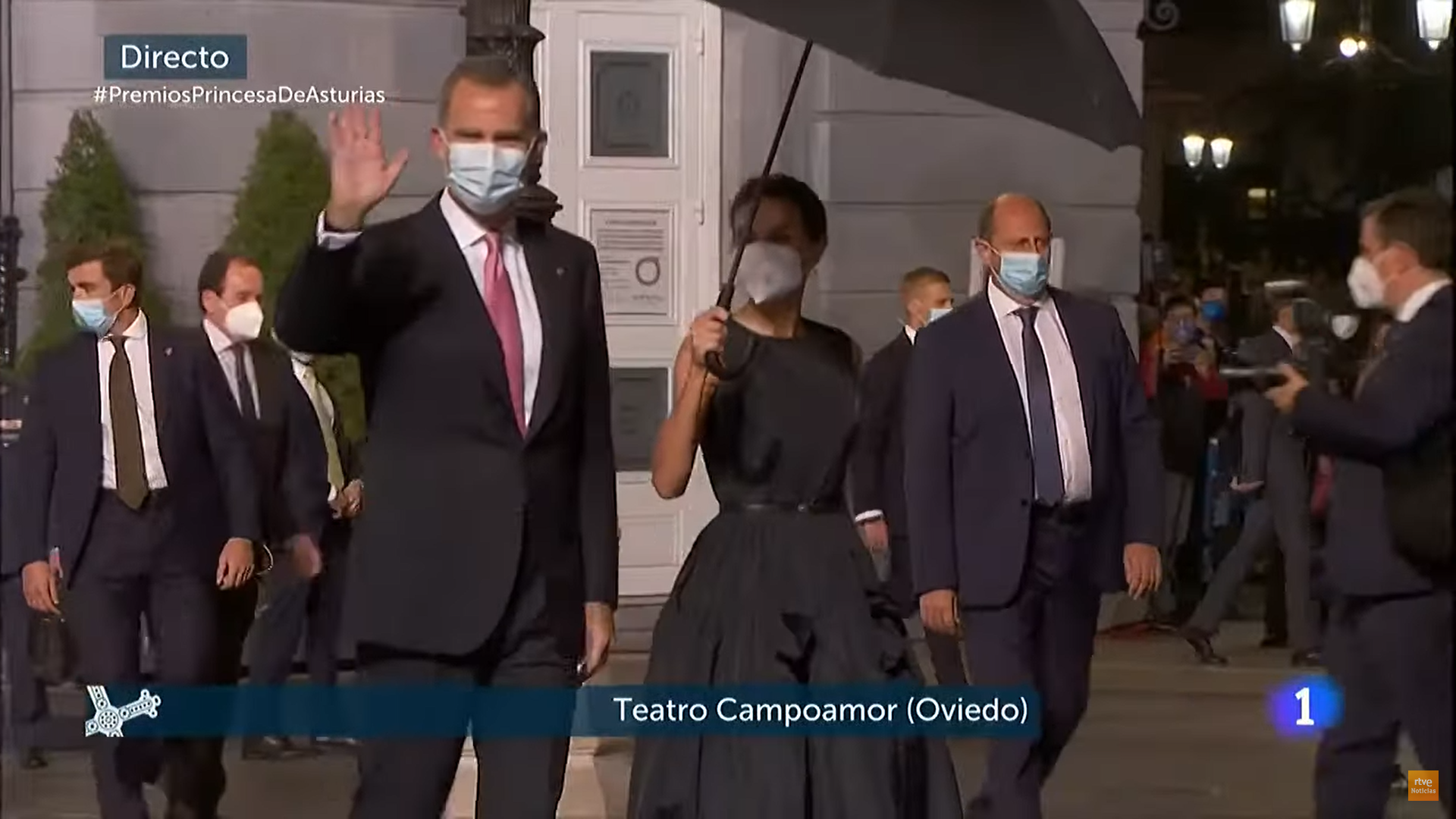 Al concluir la citada entrega de premios, cuando el matrimonio sale a la calle, el rey Felipe coge en su mano un paraguas que les cubría a ambos de la lluvia. Dª. Letizia se da cuenta del público congregado que les esperaba, y cede todo el protagonismo al rey cogiéndole el paraguas con el fin de que él tuviese sus manos libres para saludar. Observemos la secuencia fotográfica porque es muy interesante:
