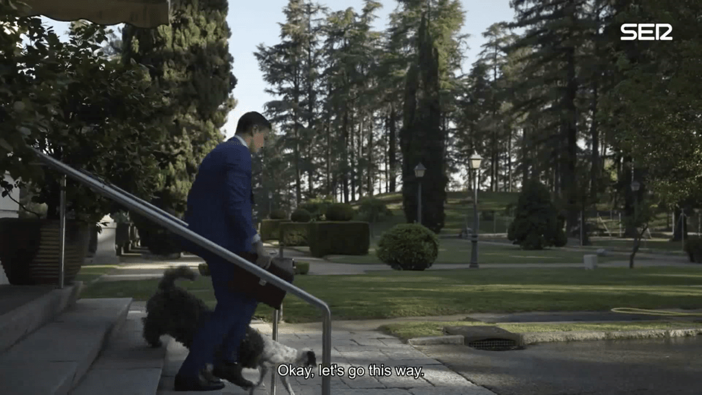 Le escuchamos saludar a personal de los jardines de La Moncloa y salir a pasear con sus perros, aunque hacerlo con traje y cartera, resulta chocante.