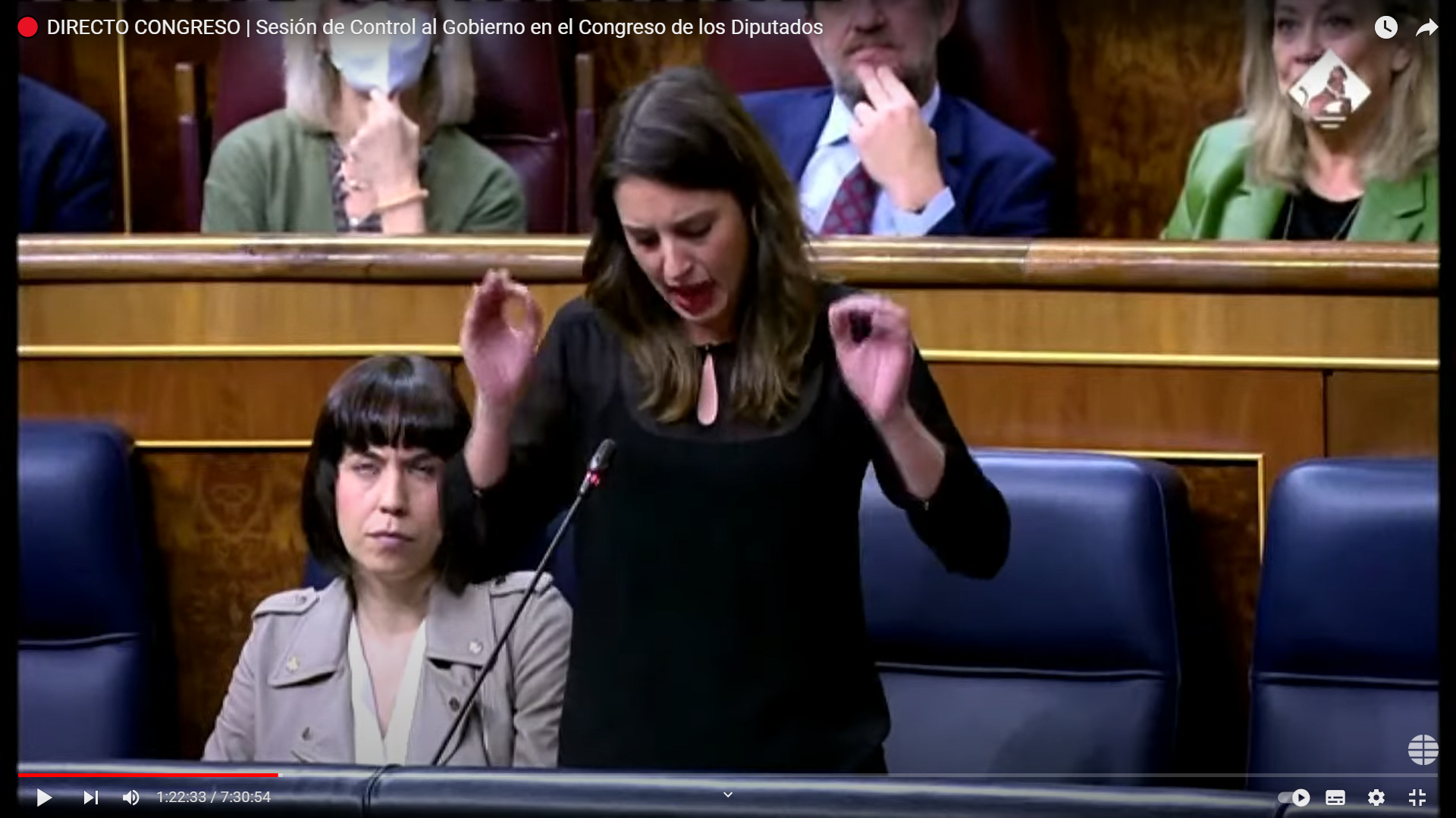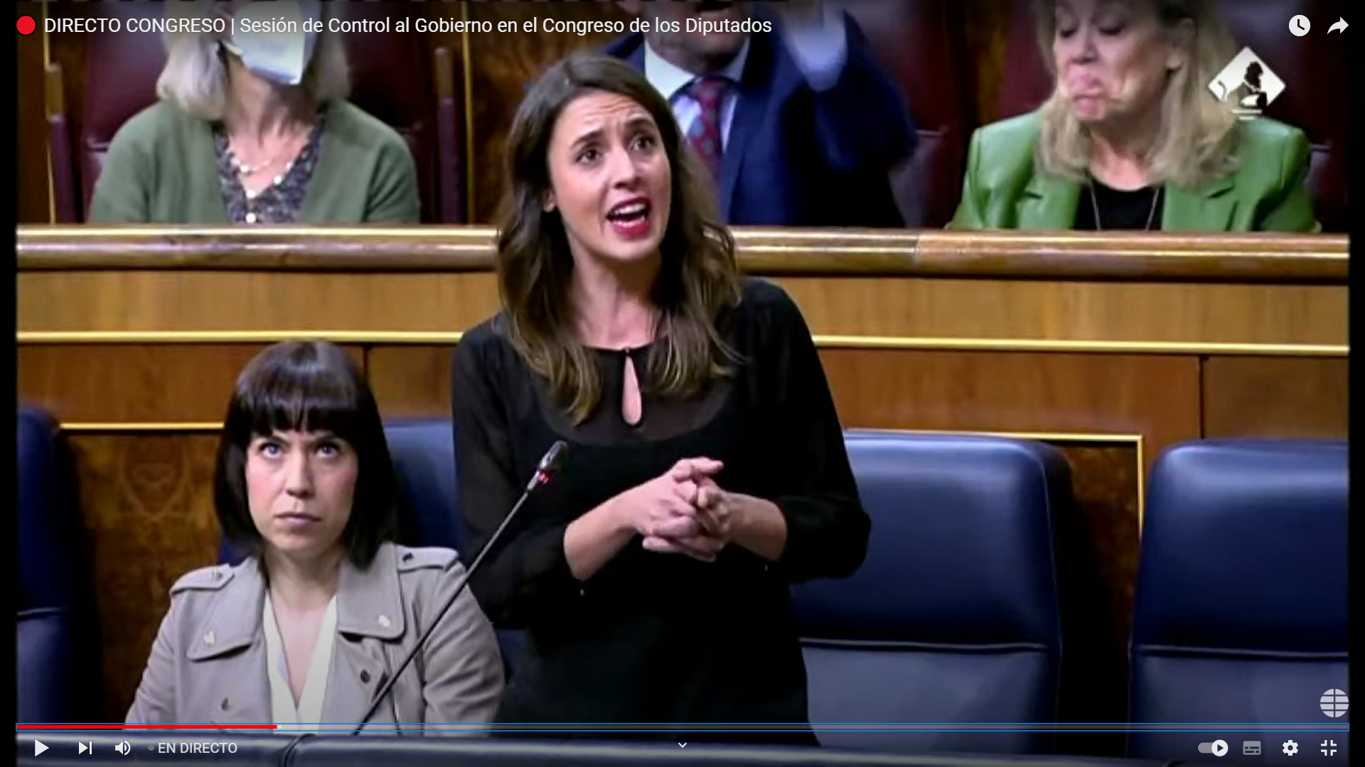 - Cuando concluye su intervención Irene Montero, mira en dirección contraria a ella, buscando a sus otros compañeros ministros.
