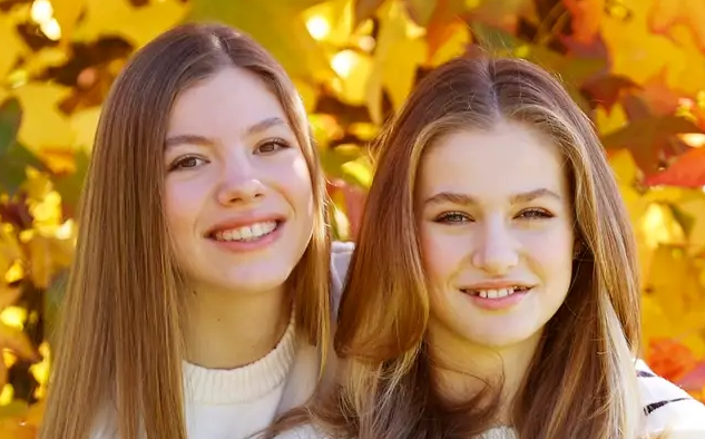 A pesar de que ambas jóvenes siempre son muy sonrientes, transmiten una abierta alegría en sus actos públicos, aquí parecen más forzadas, principalmente la princesa Leonor. Las sonrisas son muy horizontales, no suben por sus mejillas aunque sí que achinan sus ojos. Creo que pone más empeño en sonreír Sofía que Leonor, que podría estar, en esos momentos, más cansada o con menos ganas de sonreír.