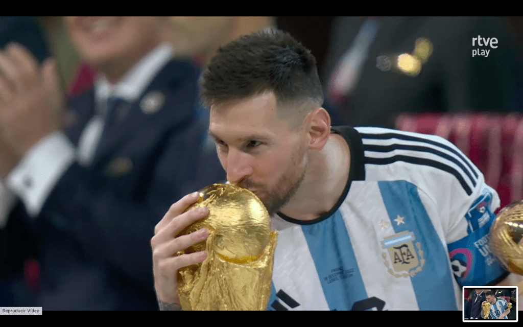 UN BESO CON SABOR A FELICIDAD: Ha sido el primer beso que Messi ha dado al trofeo que ha ganado su selección y el único que a él le faltaba en su vitrina. Y yo me pregunto… ¿Cuántas veces este beso no se lo habría dado ya con su mirada en el pasado y desde la distancia? Pues ha llegado el momento, el trofeo es tuyo.