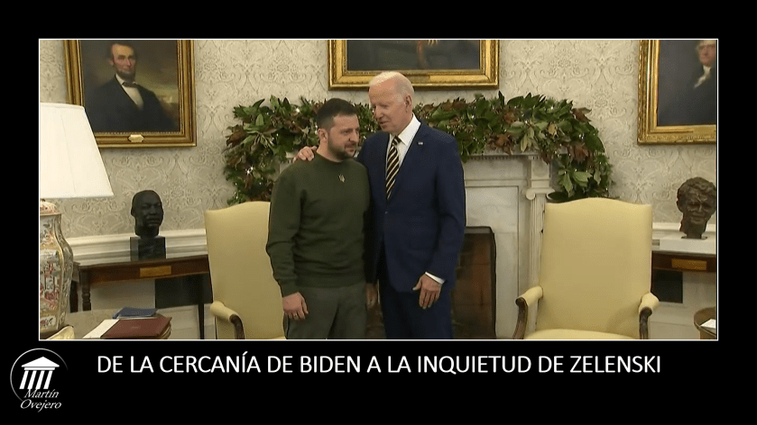 BIDEN CÓMODO Y ZELENSKI INQUIETO E IMPACIENTE: Veamos cómo se sientan uno y otro. Biden con comodidad, mientras que Zelenski casi en el borde de la silla. Incluso antes de sentarse, el presidente ucraniano se queda bastante tiempo con los ojos cerrados y traga saliva de manera ostensible. Me parece claro que no viene para la foto.