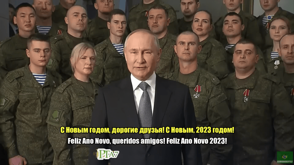 El mensaje de Putin es más sencillo, claro y luminoso. Además, aunque sí aparece por delante de sus tropas, respecto al espectador se mantiene en un plano de igualdad. Su imagen no cambia… tal y como comienza termina.
