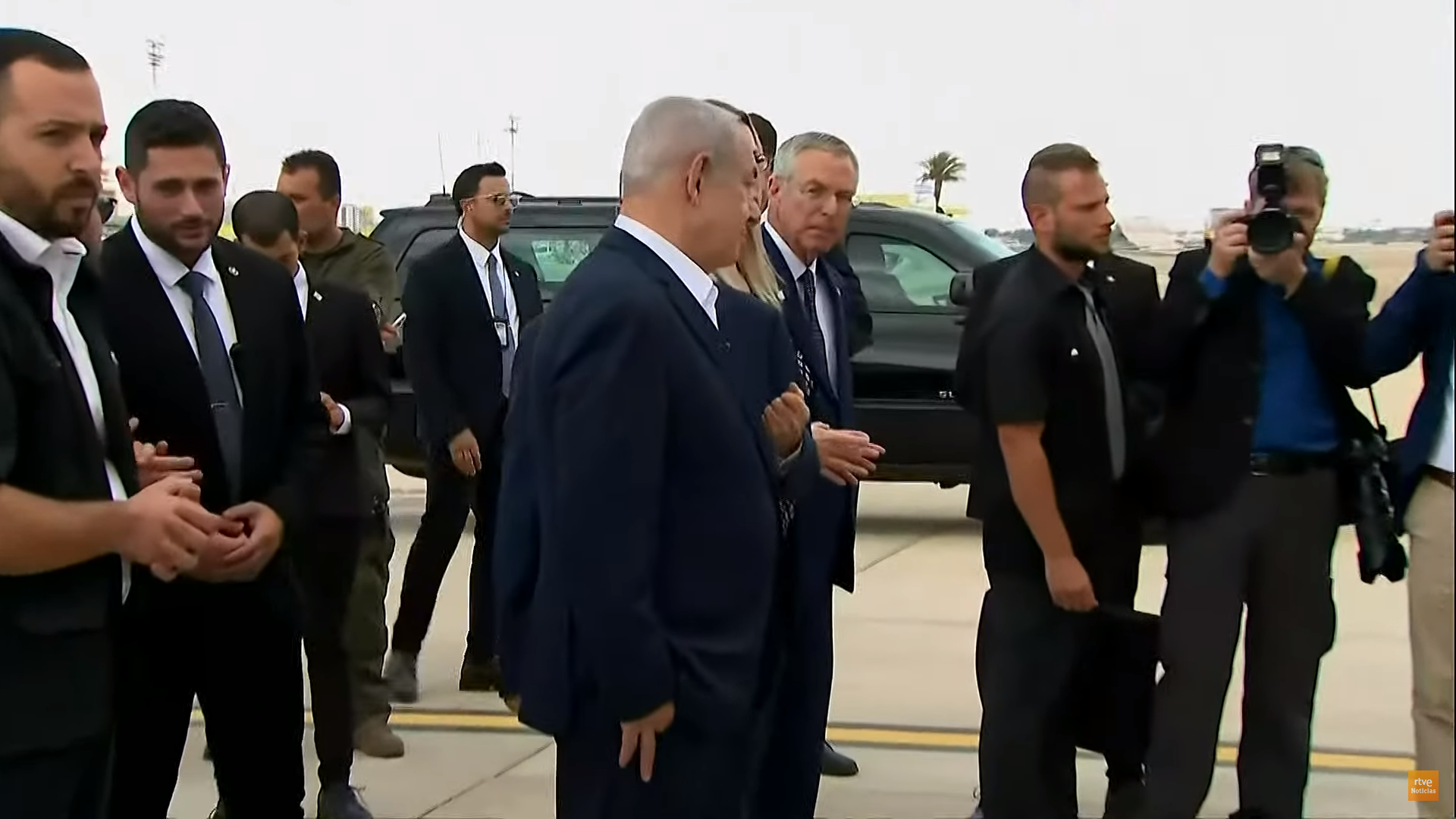CON DESEOS DE ACERCAMIENTO: Veamos cómo el presidente de Israel, inmediatamente le coloca su mano derecha en el brazo al americano y la mantiene, algo que, en este contexto, suele estar muy estudiado para transmitir una sensación de cordialidad, de alianza y de proximidad.