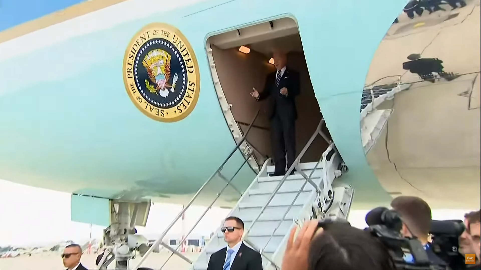 Nada más aparecer Biden en la escalinata de su avión, ya lanza un gesto de acogimiento a dos manos desde la distancia
