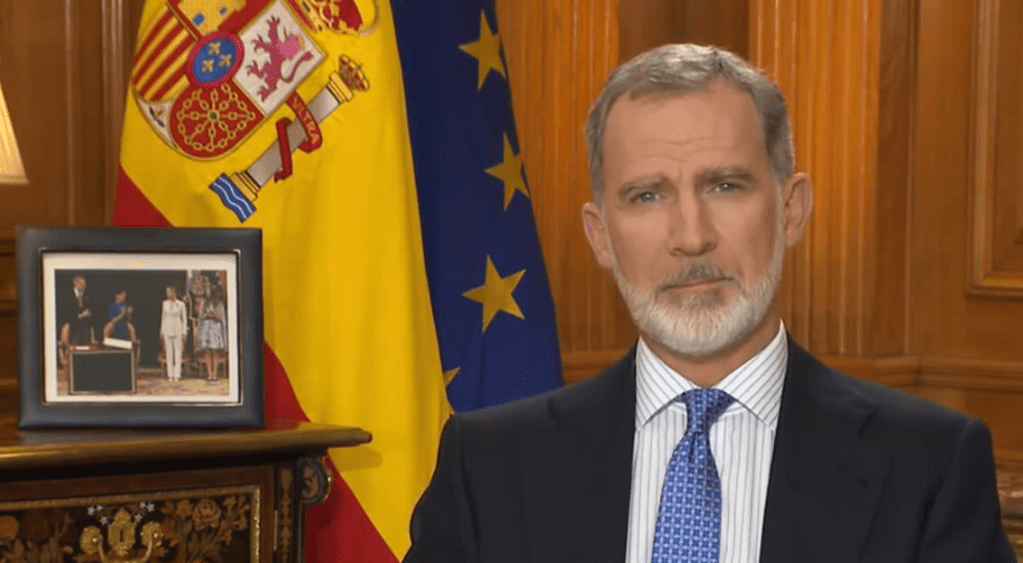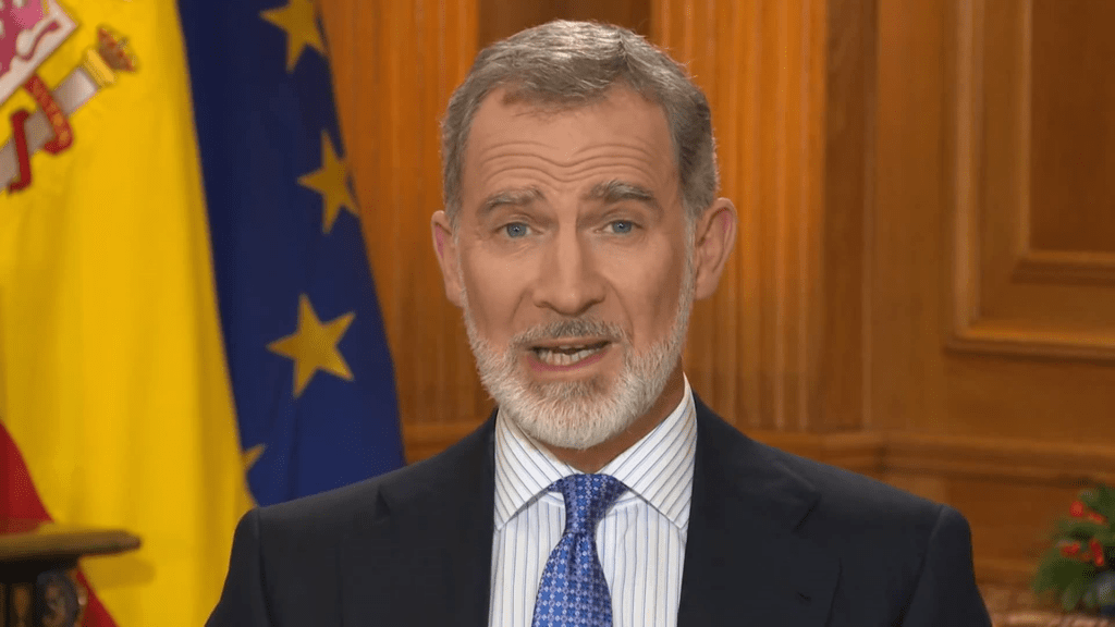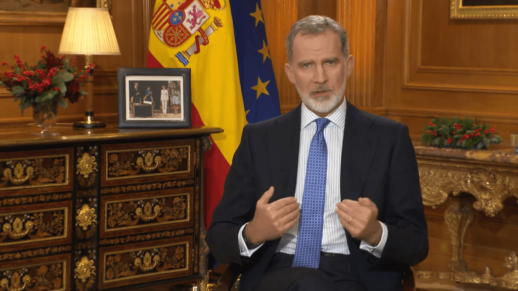El Rey ha aparecido rodeado de las banderas de España y Europa, el Belén, un árbol de navidad… todo esto muy normal y habitual.