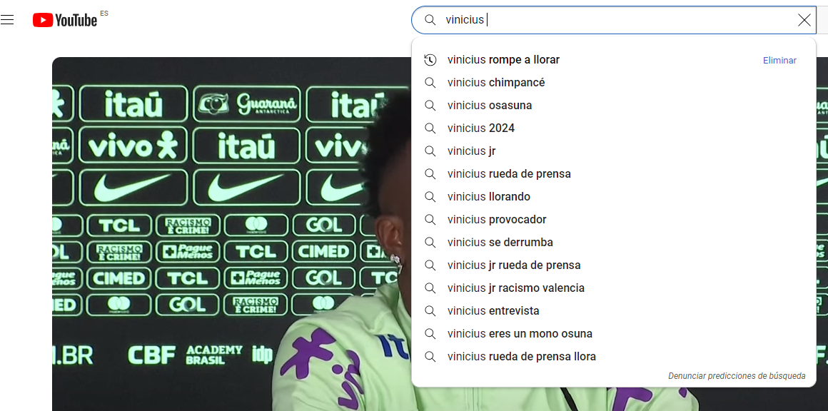 Considero sinceras sus lágrimas como muestra de tristeza y yo mismo me he quedado sorprendido, cuando buscaba información en YouTube de Vinicius que, al escribir su nombre en el buscador, las dos primeras búsquedas que me han aparecido son las siguientes: “Vinicius rompe a llorar” y “Vinicius chimpancé”.
