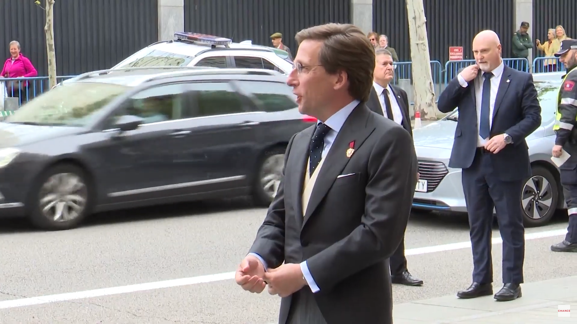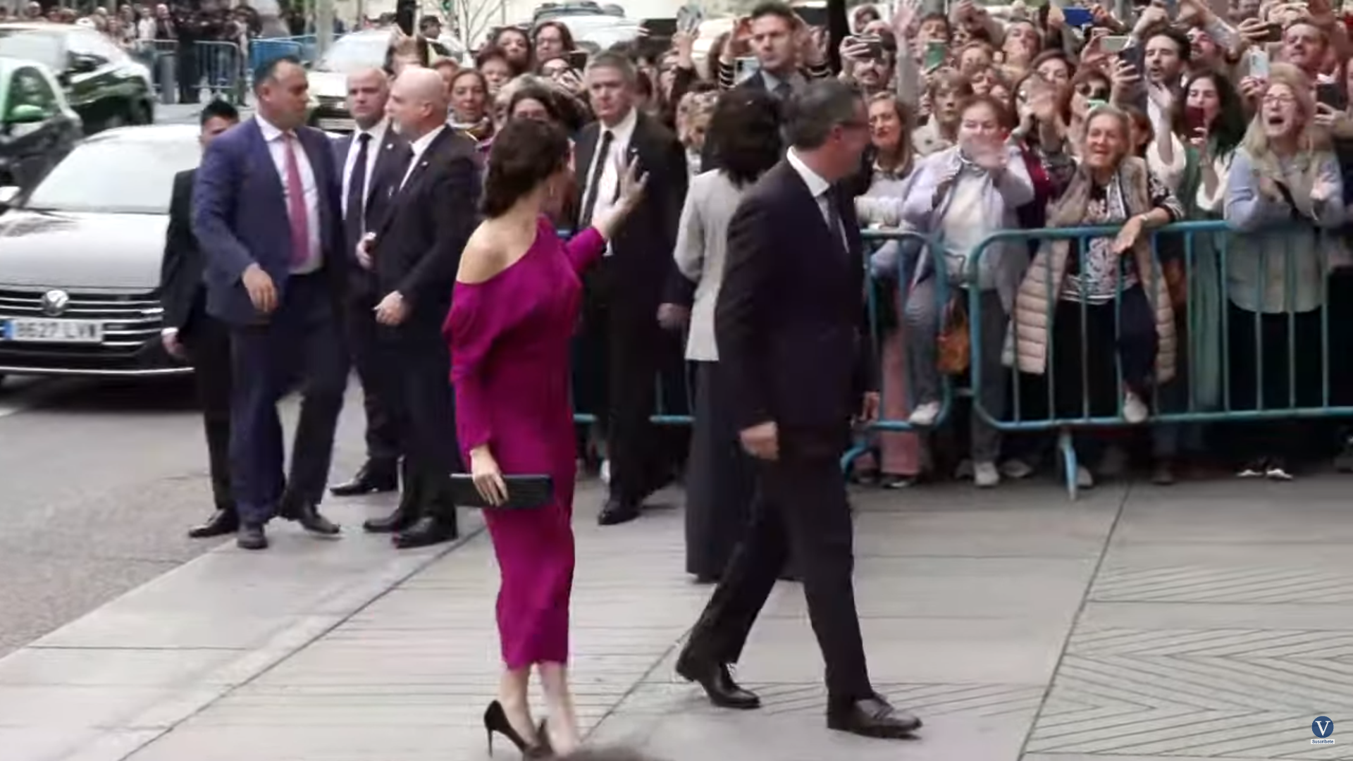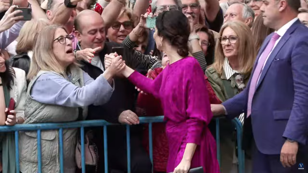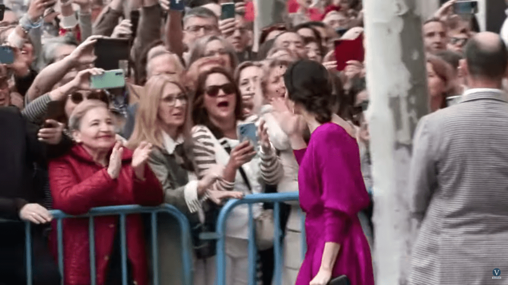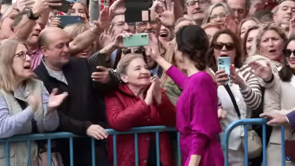 3 – AYUSO MUY ATENTA AL PÚBLICO: Saludos, besos y contacto físico. Desde que sale de su coche oficial, lo primero que hace es saludar al público congregado alrededor de la iglesia. También les lanza besos con la mano e incluso se acerca y toca a algunas de las personas presentes. Se ha mostrado muy cercana a la gente y no ha lanzado, en ningún momento, mensajes asociados a temor o a vergüenza, más bien todo lo contrario.