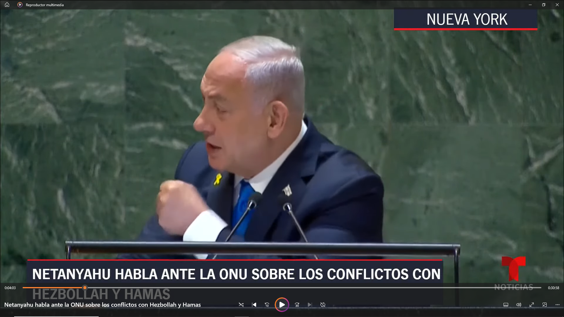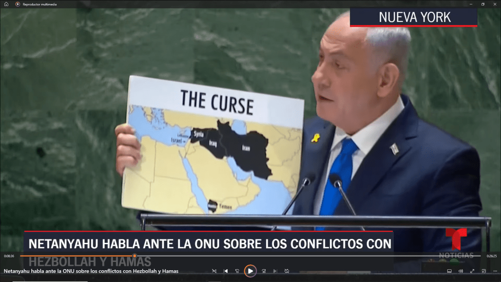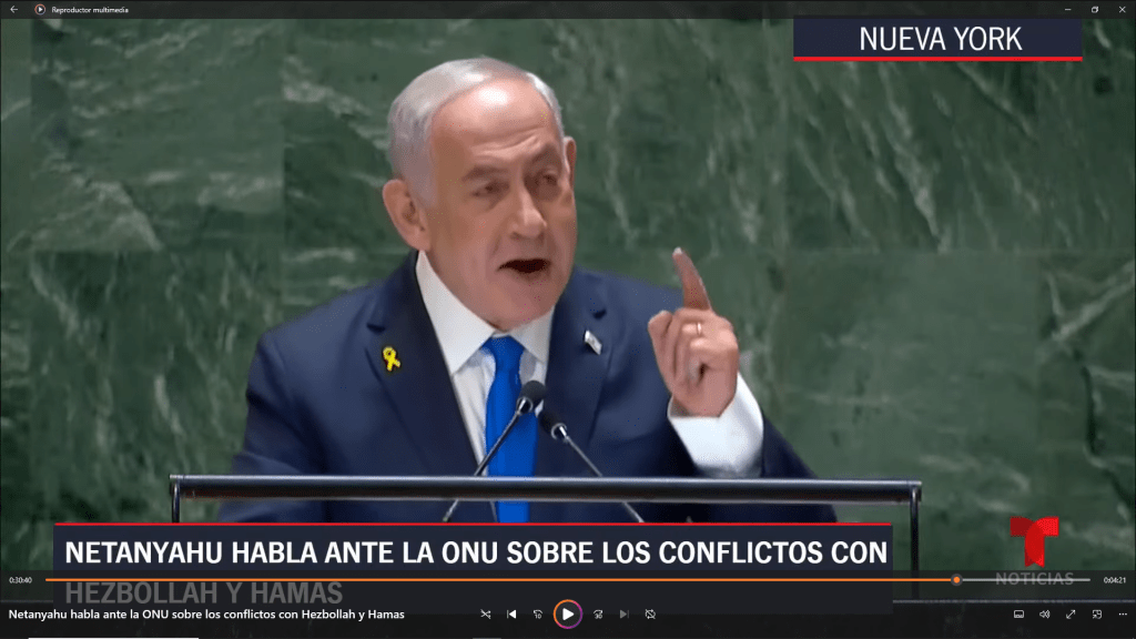 El primer ministro de Israel, Benjamín Netanyahu, toma la palabra en la ONU. Considero este discurso especialmente interesante desde la óptica tanto de la comunicación no verbal como de los recursos de oratoria, dado que su propósito era lanzar una imagen de justicia y fuerza de Israel, y en su mente ya estaba lanzar un ataque mortal contra el líder de Hizbulá y su cúpula de mando, tal y como hizo, consiguiendo su propósito.