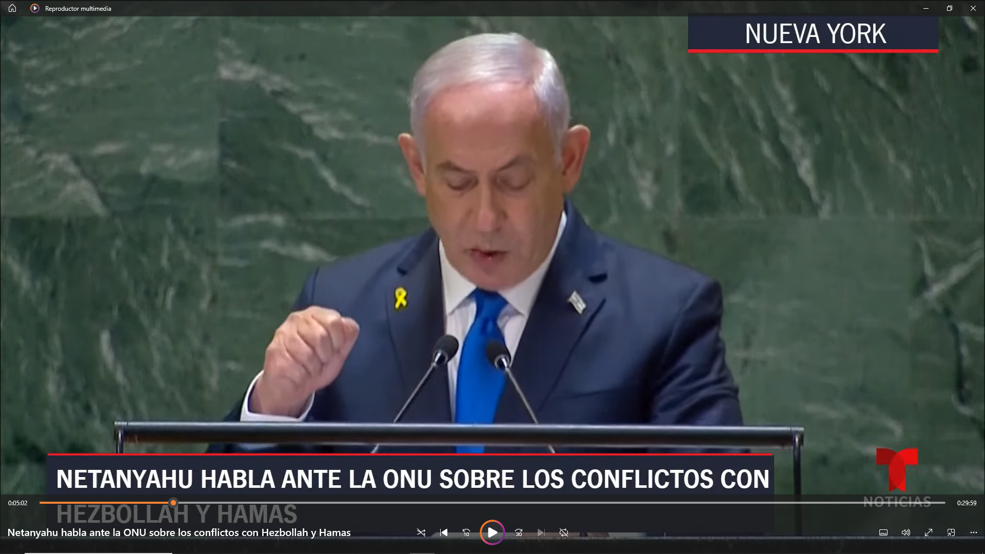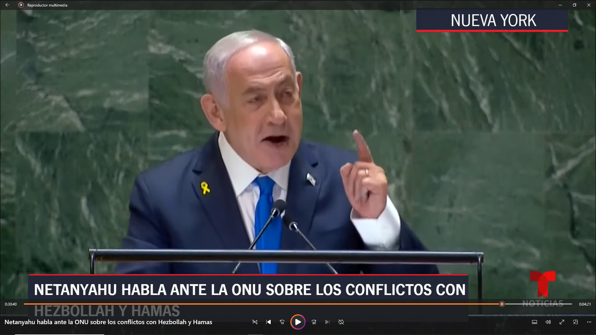 8 – IMAGEN PERSONAL CARGADA DE SIMBOLISMO: Corbata del color azul de la bandera de Israel, con insignia en la solapa con su bandera y con un lazo amarillo. Tal y como informa del medio de comunicación el Heraldo: “Este lazo amarillo se ha convertido en Israel en un símbolo para reivindicar la paz y el fin de la guerra en la franja, pero el propio Netanyahu se ha dejado ver con un lazo de este color en su traje, una imagen que ha generado muchas críticas por parte de las familias afectadas, exigiéndole que no lo vuelva a llevar.” (https://www.heraldo.es/noticias/internacional/2024/09/27/netanyahu-lazo-amarillo-lideres-proces-1765473.html)