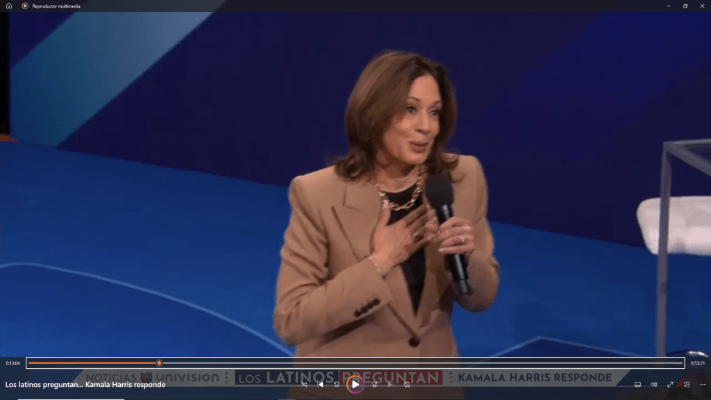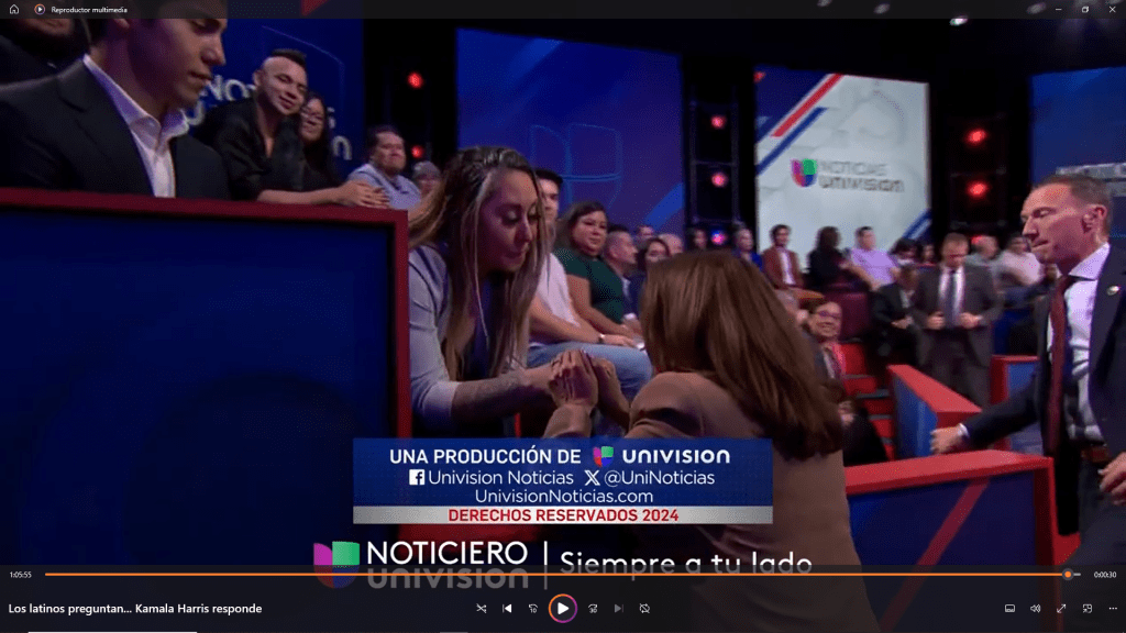 Harris ha conectado con el público dado dado que he visto cómo su rostro empatizaba a nivel emocional con lo que podrían estar sintiendo las personas que le preguntaban. Principalmente con una mujer que, entre lágrimas, le ha hablado de su madre recién fallecida. Con ella se ha ganado un punto adicional, tanto para la propia mujer como para los espectadores que han visto lo que Harris ha hecho al terminar el programa: acudir a hablar con ella más a solas cogiéndola con ambas manos. Creo que esta acción ha sido el mayor acierto de Harris.