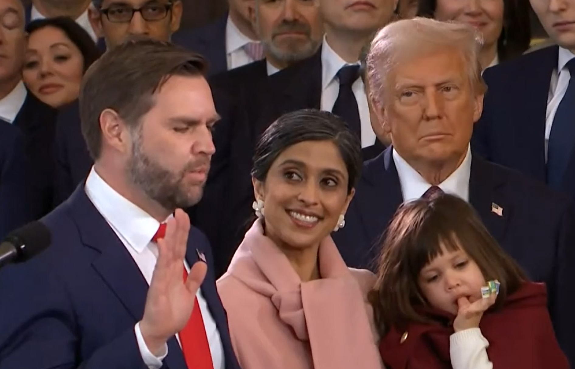 3- SU VICEPRESICENTE DAVID VANCE MÁS RELAJADO: aunque a quien quiero destacar por la manera de mirarle es a su esposa, tan ilusionada y alegre. Vamos, venga, juega a las diferencias con la esposa de Trump.
