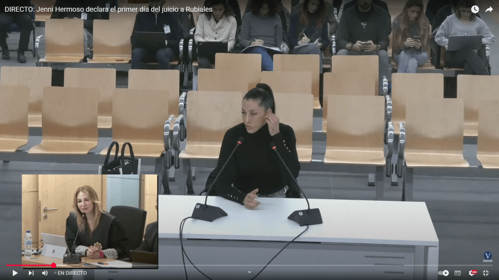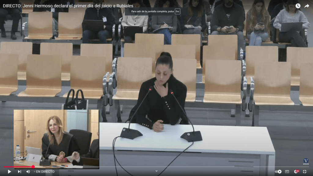 La futbolista de la selección española Jennifer Hermoso ha declarado en el juicio contra Luis Rubiales y otros acusados, todo ello a raíz del beso en la boca que éste le da en la celebración y de los posteriores actos que se producen para que ella quite importancia al asunto.