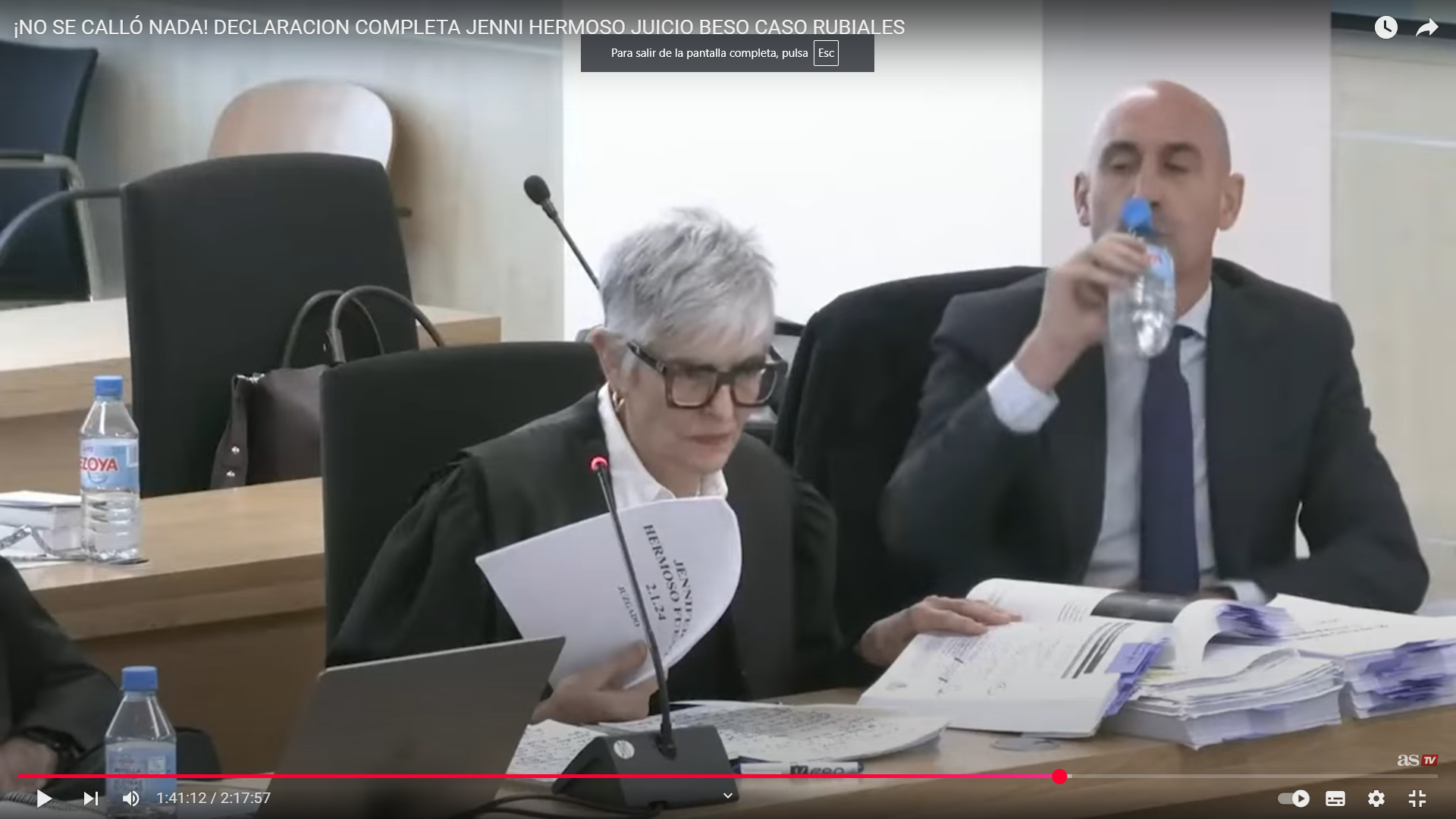 Le he visto beber de una botella pequeña de agua mineral varias veces durante el tiempo en que Jenni Hermoso responde a su abogada, a pesar de que él no habla. Lo achaco a estrés. Cuando el cerebro está muy estresado tiende a cortar la salivación y eso hace que se nos seque la boca, por lo que precisemos del agua para suplir la saliva.