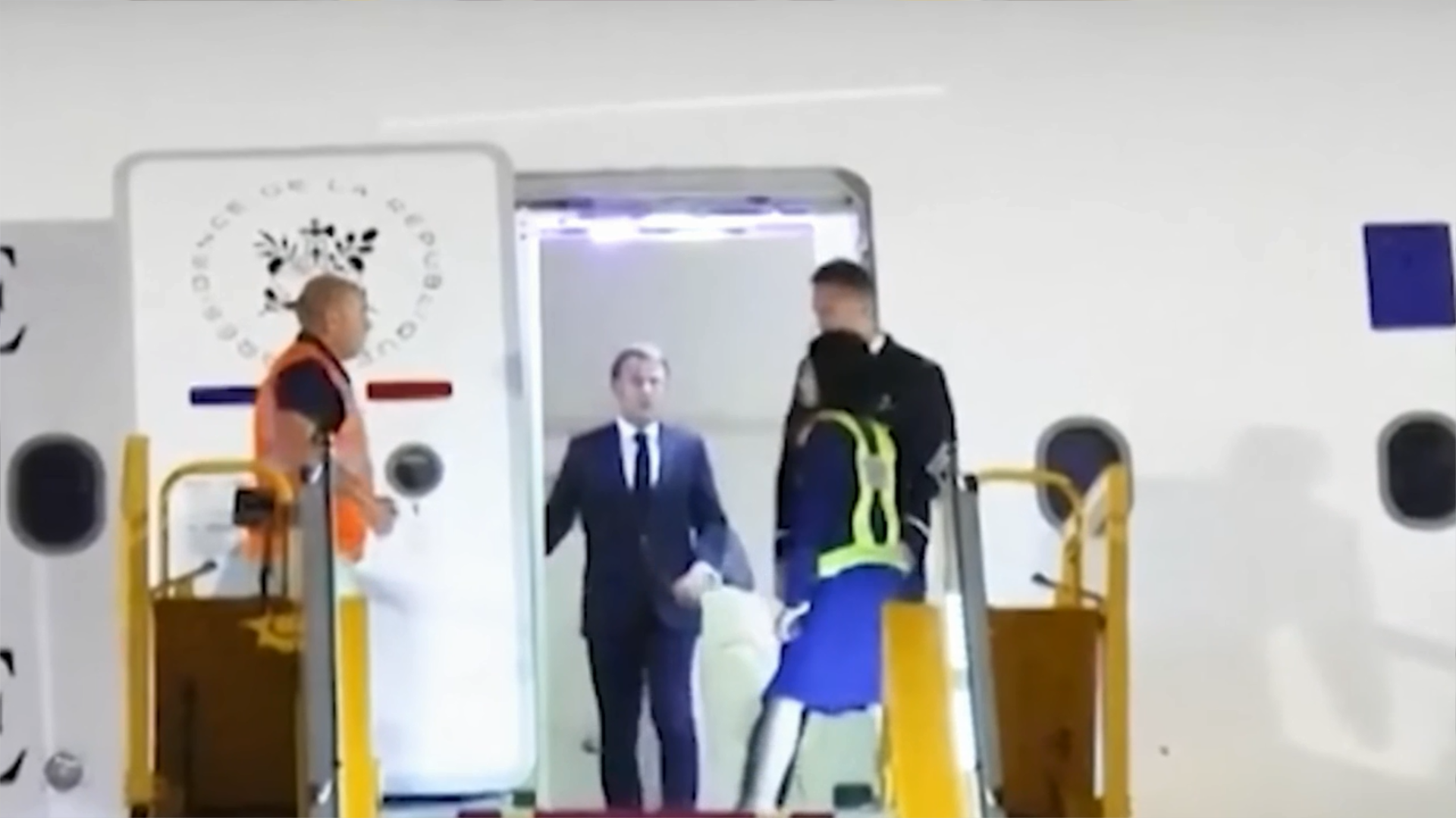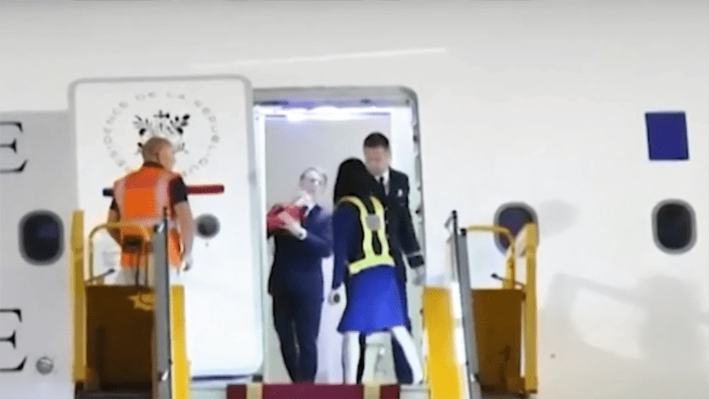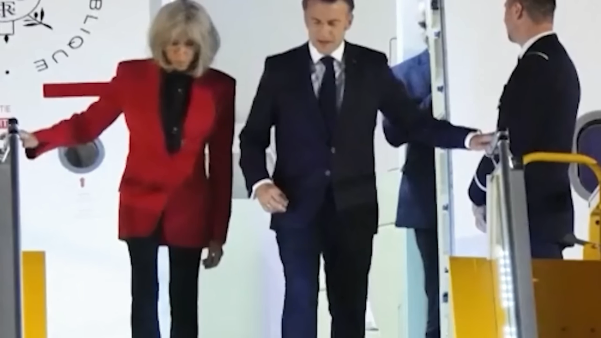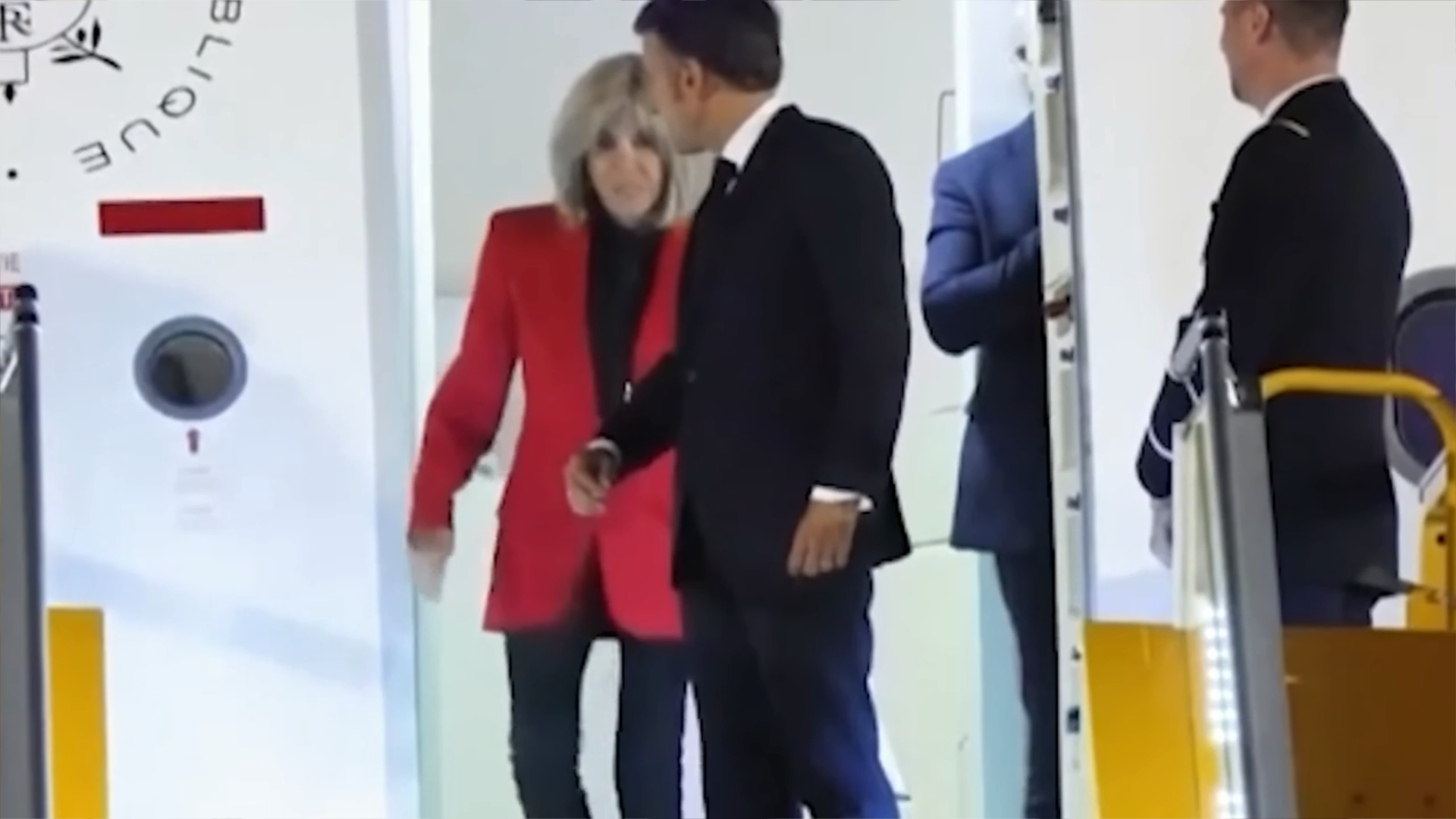 EL BRAZO DE MACRON: Pone a disposición de su mujer su brazo para que se agarre al mismo al bajar de la escalinata del avión, pero ella no se agarra, parece que ya le ha «tocado» suficiente.