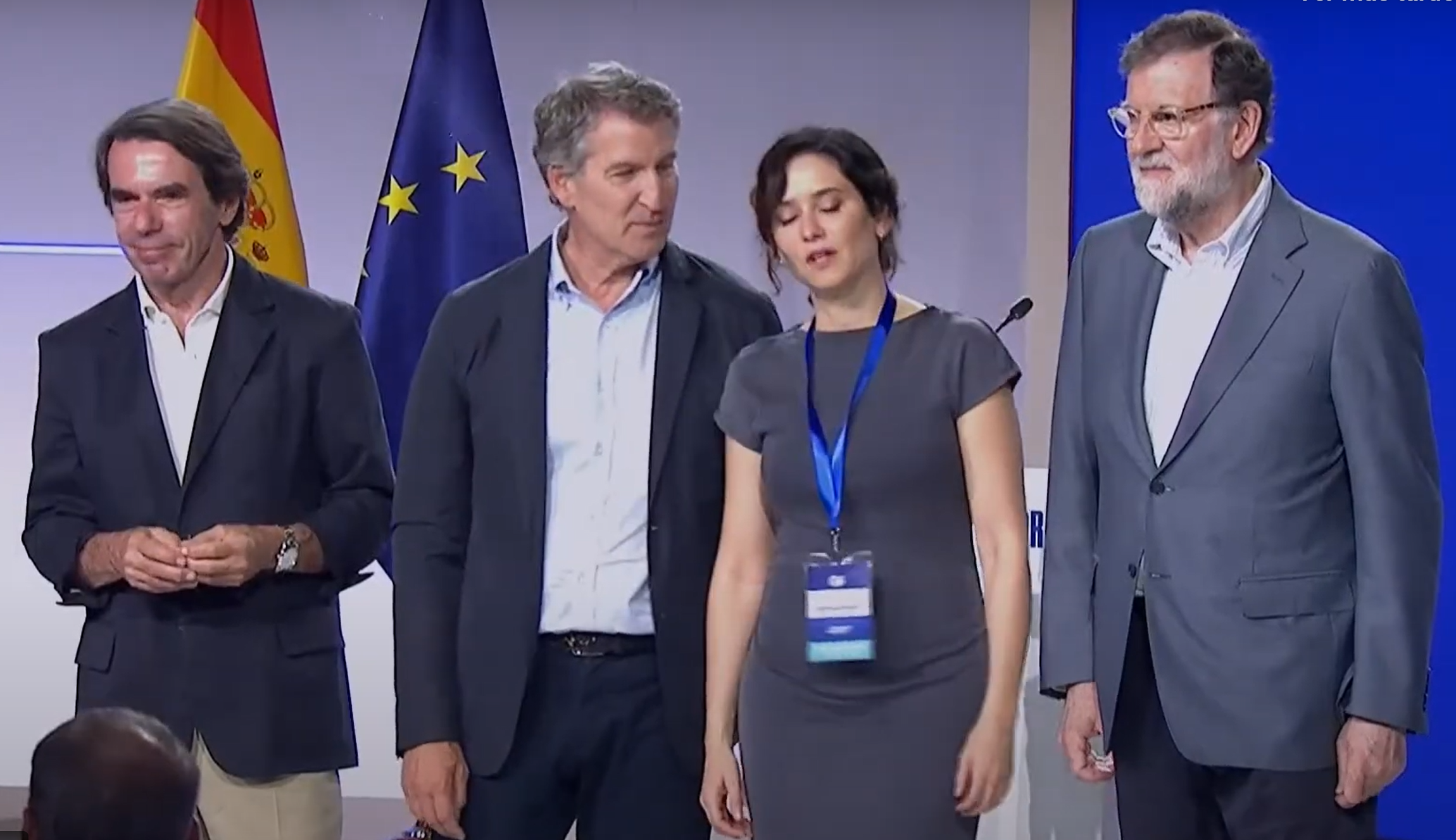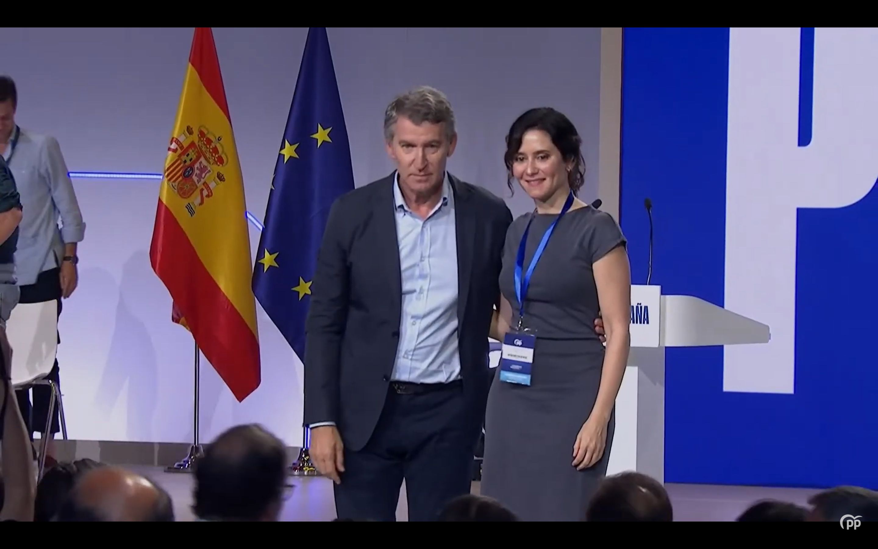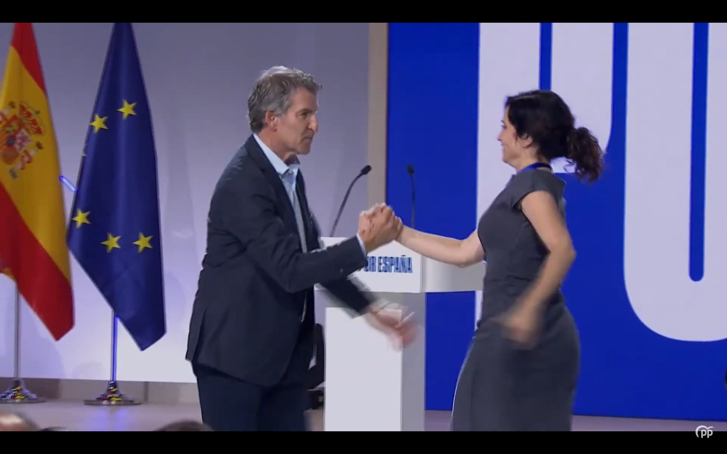 El los últimos instantes del acto, ya en el cierre y despedida del congreso, la persona a la que llama Feijóo para que le acompañe en el escenario es a Isabel Díaz Ayuso: a la primera y la única que no sea un expresidente del Gobierno.