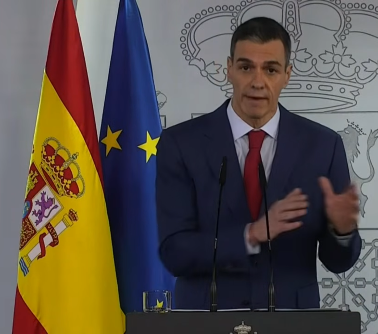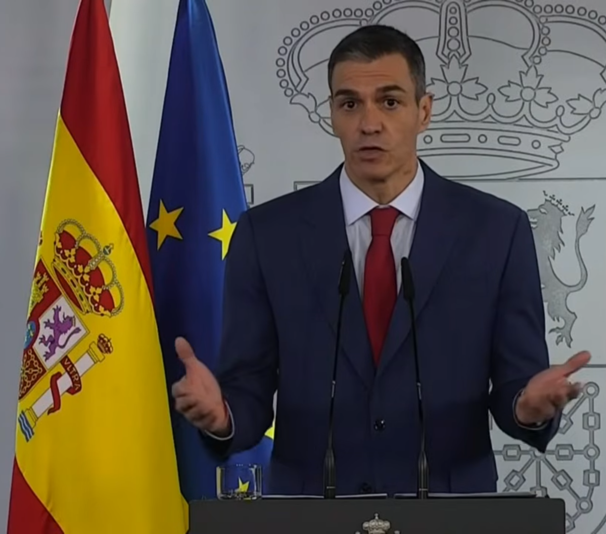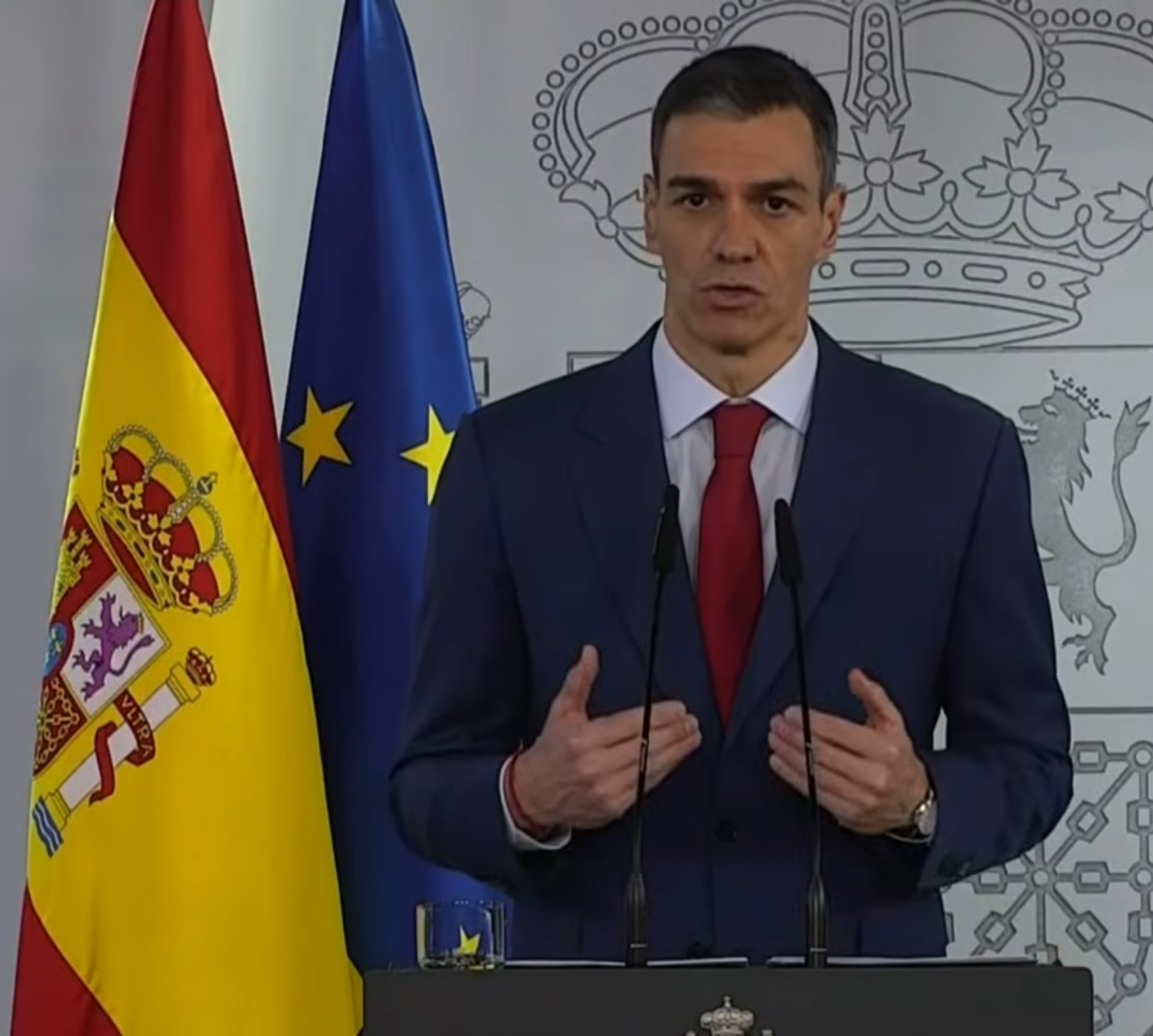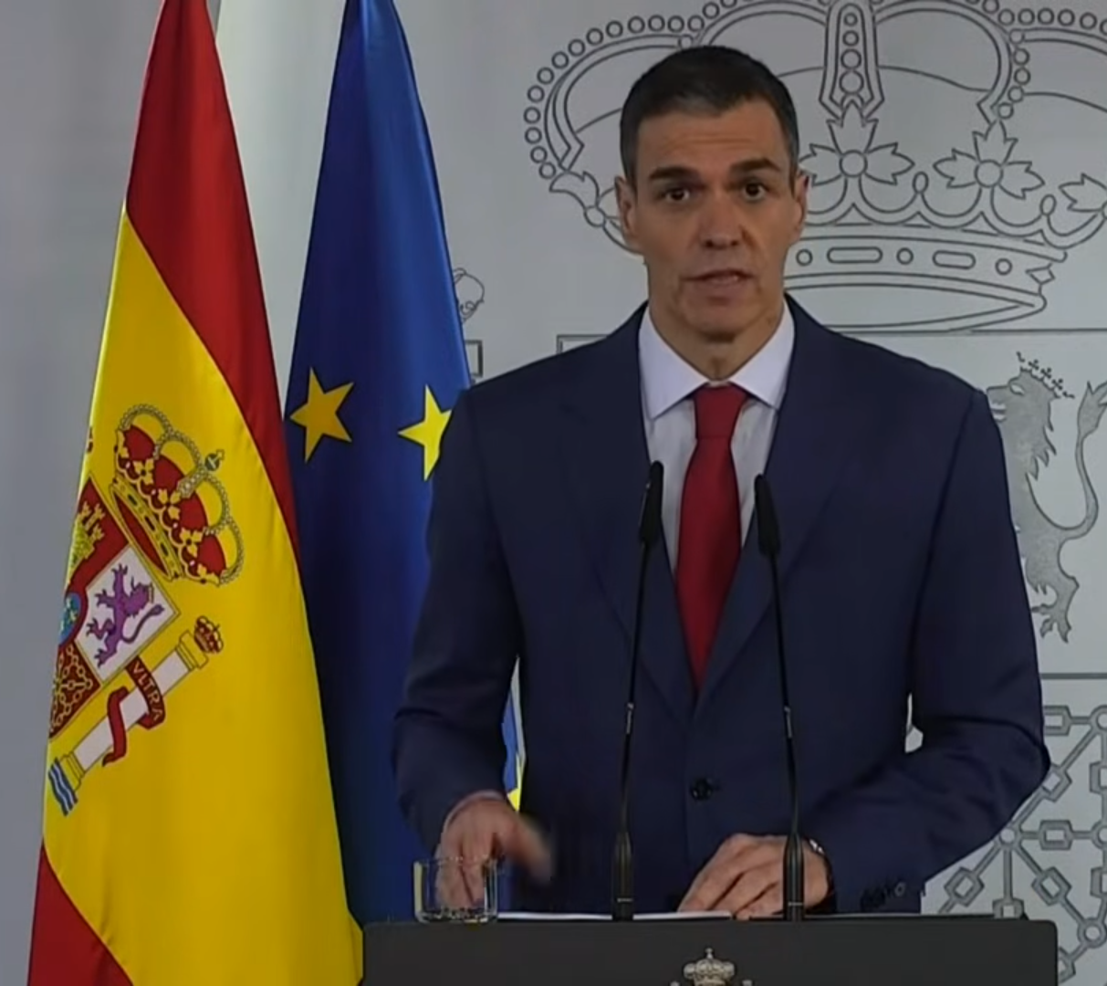 -3- CON LAS BANDERAS DE ESPAÑA Y EUROPA QUE LE ARROPAN: El mensaje es muy claro, hablo en nombre de mi país, de España, pero somos Europa. Para que nadie lo olvide.